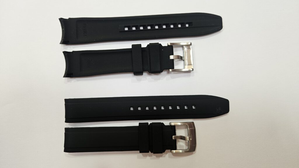 Correa de silicona negra de 20mm. Terminales curvos para mejor encaje en cajas redondas. Hebilla de acero.